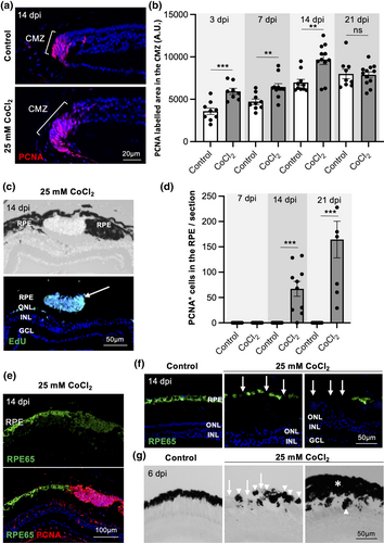 CMZ cell proliferation and RPE reprogramming following a 25 mM CoCl2 intraocular injection in X. laevis. (a, b) Analysis of CMZ cell proliferation at different time points, as indicated, following injection of a saline solution (control) or 25 mM CoCl2. Shown in (A) are representative images of PCNA staining within the CMZ. Shown in (b) is the quantification of the PCNA-labeled area in the CMZ from 3 to 21 dpi. (c) Representative images (brightfield and EdU labelling) of retinal sections from stage 51–54 tadpoles, 14 days after injection of 25 mM CoCl2. Tadpoles were exposed to EdU for three days prior to fixation. The arrow points to a cluster of proliferative cells in the RPE layer. (d) Quantification of PCNA-positive cells within the RPE, 7, 14, and 21 days after injection of a saline solution (control) or 25 mM CoCl2. (e) Representative images of retinal sections from CoCl2-injected tadpoles, co-labeled for RPE65 and PCNA at 14 dpi. (f, g) RPE65 immunolabeling (f; 14 dpi) or brightfield images (g; 6 dpi), following injection of a saline solution (control) or 25 mM CoCl2. Arrows point to RPE defects (loss of pigmentation or RPE65 staining), arrowheads point to RPE pellets, and the asterisk indicates RPE thickening. In all fluorescent images, nuclei are counterstained with Hoechst. In graphs, data are represented as mean ± SEM, and each point represents one retina. ns, not significant, **p < .01, ***p < .001 (Mann–Whitney tests). CMZ, ciliary marginal zone; GCL, ganglion cell layer; INL, inner nuclear layer; ONL, outer nuclear layer; RPE, retinal pigmented epithelium. |