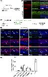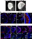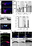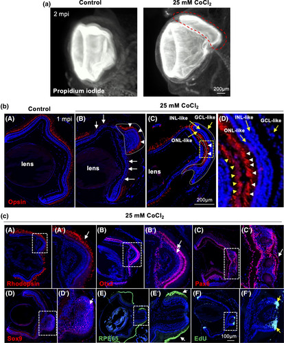 Formation of a layered retina-like structure from RPE, following a 25 mM CoCl2 intraocular injection in X. laevis. (a) Stage 51–54 X. laevis tadpoles were intraocularly injected with a saline solution (control) or with 25 mM CoCl2. They were then processed at 2 mpi for tissue clearing and propidium iodide staining before being imaged by light-sheet microscopy. The red dotted line delineates the newly formed retina-like ectopic structure. (b) Opsin staining analysis at 1 mpi on retinal sections, following intraocular injection of a saline solution (control) or 25 mM CoCl2. The dotted white lines delineate the RPE-derived ectopic retina-like structure. In panels (bB) and (bC), the retina-like structures show opposite orientations. Shown in (bD) is an enlargement of the yellow dashed box in (bC). Yellow arrows point to the three layers of the retina like structure. White arrowheads point to new cones formed in the ectopic retina-like structures. White arrows in (bB) highlight the absence of cone regeneration in the central retina when the ectopic structure has the same orientation as the original retina. In contrast, some regeneration occurs in contact with the ectopic structure, when this one is inverted (yellow arrowheads in (bD)). (c) Immunodetection of different retinal cell markers or EdU labeling, as indicated, in CoCl2 injected retinas exhibiting an ectopic retina-like structure. Panels A', B', C', D', E', and F' are enlargements of the RPE-derived retina-like structures delineated by dotted boxes on the corresponding images. White arrows point to the labeled layers in these structures. Yellow arrows in F' point to the CMZ-like regions. In all images, nuclei are counterstained with Hoechst. GCL, ganglion cell layer; INL, inner nuclear layer; ONL, outer nuclear layer. |