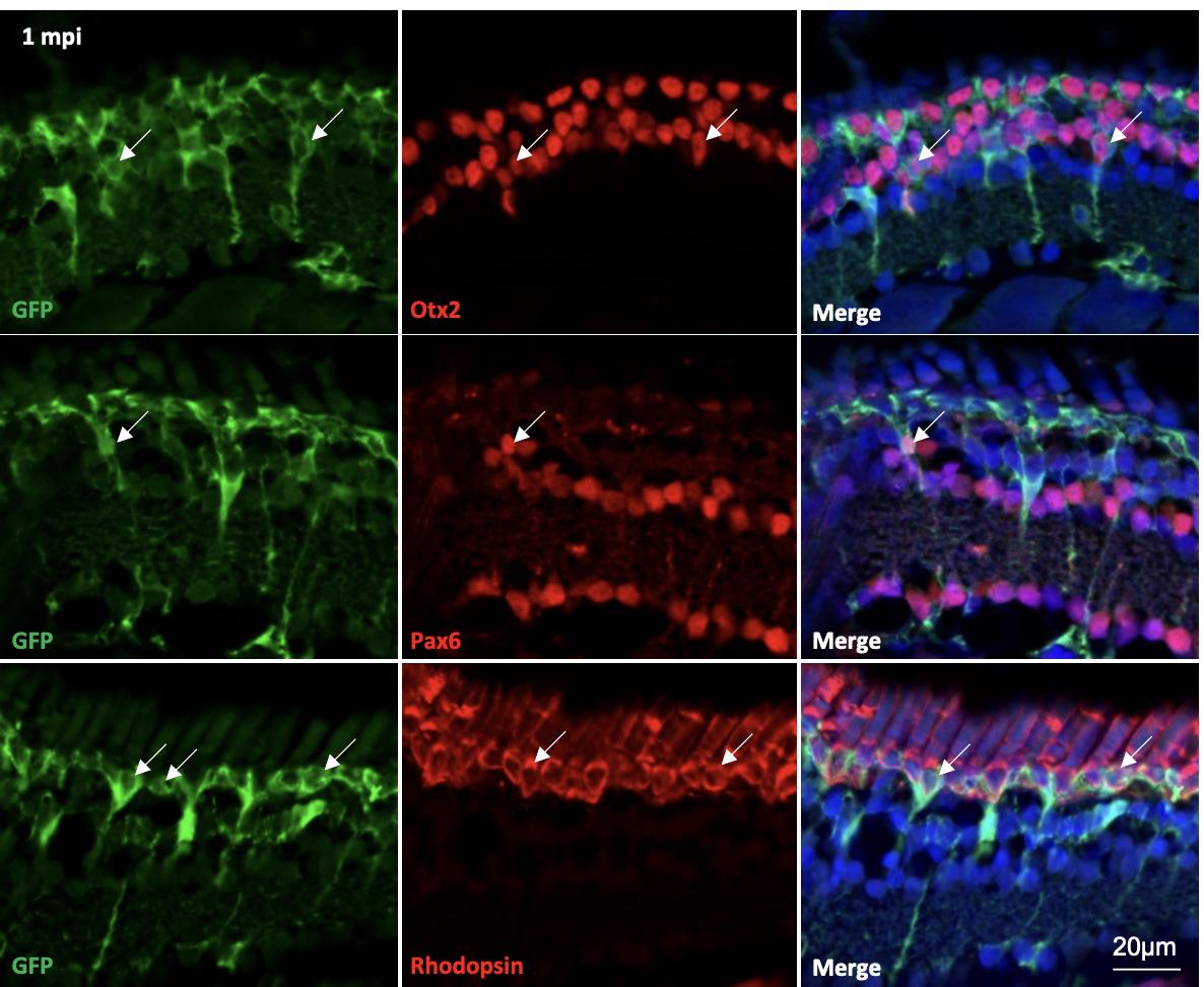 in the INL), or Rhodopsin (rods) at 1 mpi. Arrows point to double-positive cells. |