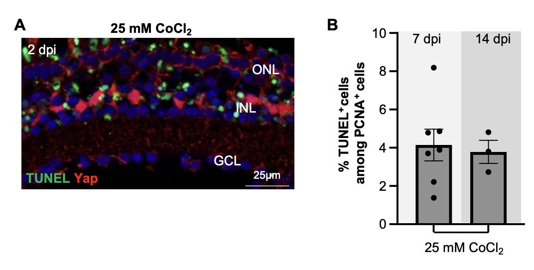 Yap at 2 dpi, following intraocular injection of 25 mM CoCl2. Cell nuclei are counterstained with