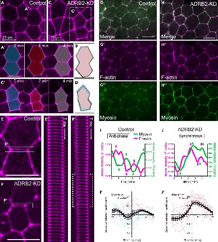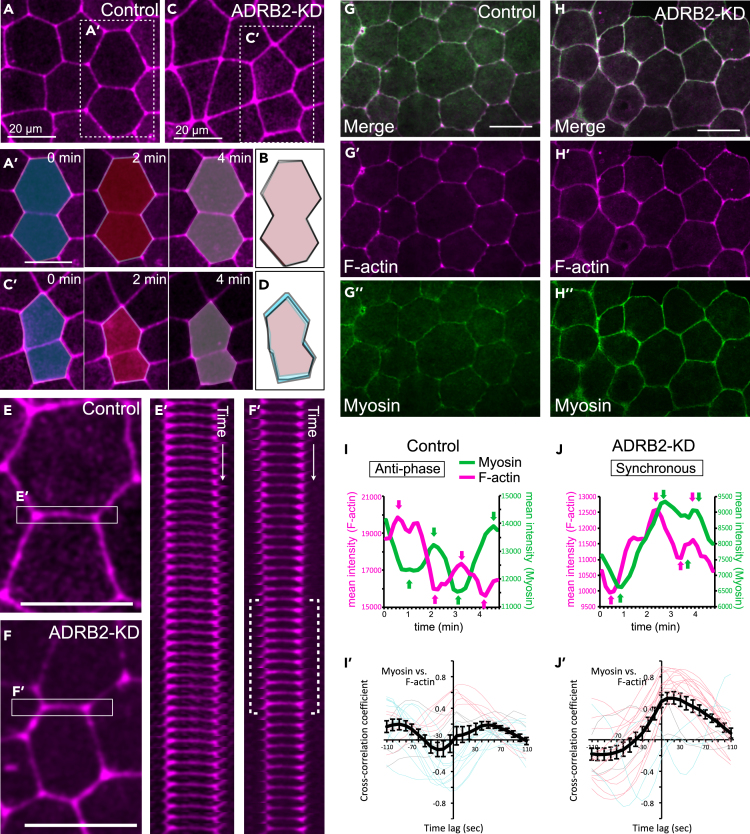 Figure 5. ADRB2 silences actomyosin contraction by unlinking F-actin and myosin(A–D) Live-imaging of epidermis injected with LifeAct-rfp in control (A) and adrb2-knockdown embryos (C). (A') and (C') are still images taken every 2 min from time-lapse videos of control and knockdown embryos, respectively.(B and D) Diagrams overlaying the outlines of two cells at three different time points of (A') and (C'), with each outline shown in distinct colors. Scale bar: 20 μm. All presented images are representative samples from more than 10 embryos imaged in each group.(E–F') Representative images and kymographs of individual epidermal cell junctions in control (E and E') and knockdown embryos (F and F'). The dotted bracket in the F' kymograph indicates a period where the cell junction temporarily contracts.(G–H″) Live-imaging of the epidermis injected with both LifeAct-rfp and SF9-gpf. (G–G')': control embryos; (H–H''): knockdown embryos.(I and J) The mean intensities of LifeAct-RFP and SF9-GFP were measured over time (I: control, J: knockdown).(I'–J') Cross-correlation of raw intensities of SF9 and LifeAct along cell junctions in control (I) and knockdown embryos (J'). Each red and blue line represents the result from individual cell junctions. The red line indicates synchronous oscillation, and the blue line indicates anti-phase oscillation. |