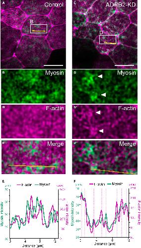 Figure 6. ADRB2 facilitates actomyosin complex on the apical surface of the epidermis (A–D″) Live imaging of the apical surface of the epidermis injected with LifeAct-rfp and SF9-gpf. (A–B')': control embryos; (C–D')': knockdown embryos. Arrowheads indicate excess myosin accumulation in the knockdown embryos. Scale bar: 20 μm. (E and F) Plot profile of raw intensities for LifeAct-RFP and SF9-GFP along the drawn line (yellow) in images (B'') and (D''), respectively. The pink dotted lines in F indicate overlapping peaks between LifeAct-RFP and SR9-GFP. |