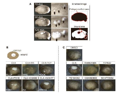 Figure S1. CLA induces a wound on the epidermis by activating actomyosin contraction. Related to Figure 1. (A) Still images from a time-lapse movie taken after treatment with 250 nM CLA. Arrows indicate the damages induced by CLA on the epidermis. Binarized images were used for measuring the embryo surface and wound areas, from which we then calculated the wound ratio and the normalized wound ratio (NWR). (B) Images of the embryos measured in Fig. 1D. Co-treatment with CLA (200 nM) and an actomyosin or kinase-related inhibitor: BB (myosin II inhibitor), 100 µM; Y27 (ROCK inhibitor), 100 µM; PD18 (ERK inhibitor), 10 µM; GSK69 (Akt kinase inhibitor), 1 µM; and SCH77 (ERK1/2 inhibitor), 1 µM. (C) Treatment with myosin-related kinase inhibitors. Images of Stage 20 embryos, after 1 h of treatment with inhibitors. DMSO, 25 µM; CLA, 200 nM; BB, 100 µM; Y27632, 10 µM; GSK690693, 1 µM; SCH772984, 1 µM (n=10 each). The concentrations used were about IC50 in cell-based assays × 100 –500. Scale bar: 500 µm. Note that CLA alone causes wounds, while others do not. (CLA, calyculin A; BB, blebbistatin; ROCK Rho-associated protein kinase; MLCK, myosin light chain kinase; ERK, extracellular signal-regulated kinase; DMSO, dimethyl sulfoxide) |