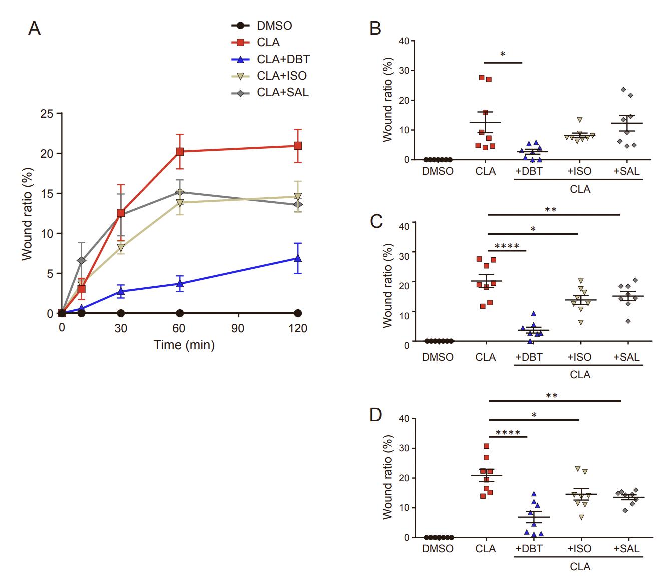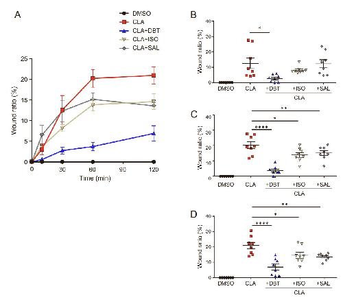 Figure S2. Several ADRB agonists suppress CLA-induced wound formation. Related to Figure 2. (A) Time-course analysis of the wound ratio at 0 to 120 min after treatment with DMSO (black), CLA (red), CLA and DBT (blue), CLA and ISO (beige), and CLA and SAL (gray). (B–D) Comparison of the wound ratio at 30 (B), 60 (C), and 120 (D) min after inhibitor treatment (*p<0.05, **p<0.001, ***p<0.001, ****p<0.0001, as assessed using one-way analysis of variance). Data are represented as mean +/- SEM. (ADRB, beta-adrenergic receptor; CLA, calyculin A; ISO, isoproterenol; DMSO, dimethyl sulfoxide; DBT, dobutamine; SAL, salbutamol) |