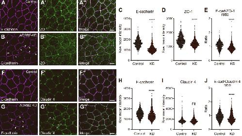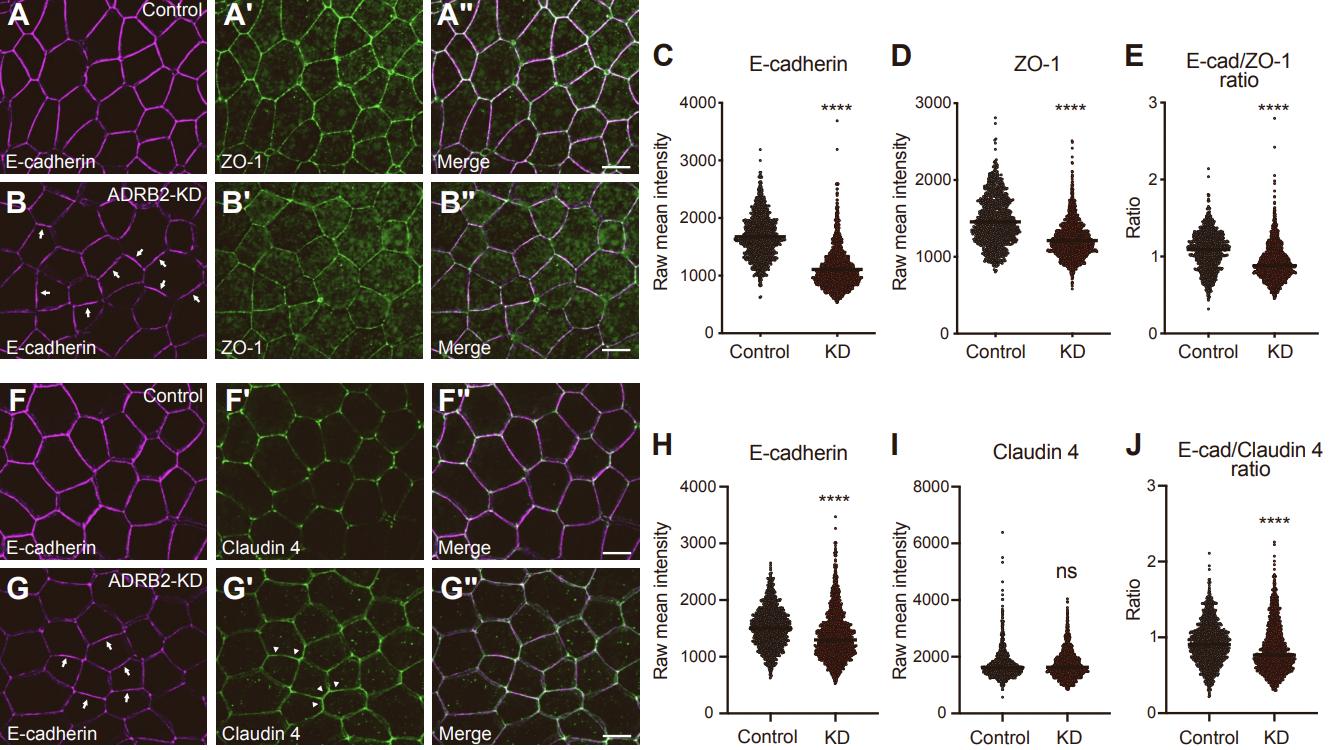 Figure S6. Apical cell adhesion molecules are influenced by adrb2 knockdown. Related to Figure 4–6. (A–B'') Immunostaining of E-cadherin and ZO-1 in the epidermis of embryos at stage 18–20. A–A'' represent control embryos, and B–B'' are from embryos injected with adrb2-MO to knockdown (KD). Arrows in B indicate cell junctions with heightened E-cadherin intensity. (C–D) Raw intensity measurements of E-cadherin (C) and ZO-1 (D) at cell junctions. (E) Intensity ratio of E-cadherin to ZO-1 for each cell junction. (F–G'') Immunostaining of E-cadherin and Claudin 4 in the epidermis of embryos at stage 18–20. F–F'' represent control embryos, and G–G'' are from embryos injected adrb2-MO. (H–I) Raw intensity measurements of E-cadherin (H) and Claudin 4 (I). (J) Intensity ratio of E-cadherin to Claudin 4 for each cell junction. (****p<0.0001, one-way analysis of variance) Scale bar: 20 µm. Data are represented as mean +/- SEM. |