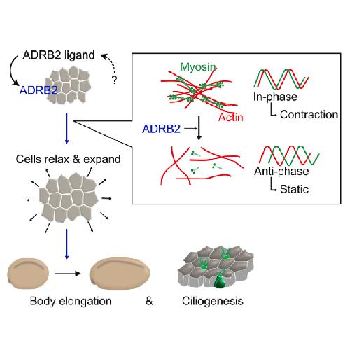 During morphogenesis, epithelial tissues reshape and expand to cover the body and organs. The molecular mechanisms of this deformability remain elusive. Here, we investigate the role of the β-adrenergic receptor (ADRB) in orchestrating actomyosin contractility, pivotal for epithelial extensibility. Chemical screens on Xenopus laevis embryos pinpointed ADRB2 as a principal regulator. ADRB2 promotes actomyosin relaxation, facilitating apical cell area expansion during body elongation. In contrast, ADRB2 knockdown results in heightened cell contraction, marked by synchronous oscillation of F-actin and myosin, impeding body elongation. ADRB2 mutants with reduced affinity for ligand binding lack the function to induce cellular relaxation, highlighting the ligand's essential roles even in the developing epidermis. Our findings unveil ADRB2's critical contribution to extensibility of the epidermis and subsequent body elongation during development. This study also offers insights into the physiology of mature epithelial organs deformed by the smooth muscle response to the adrenergic autonomic nervous system.