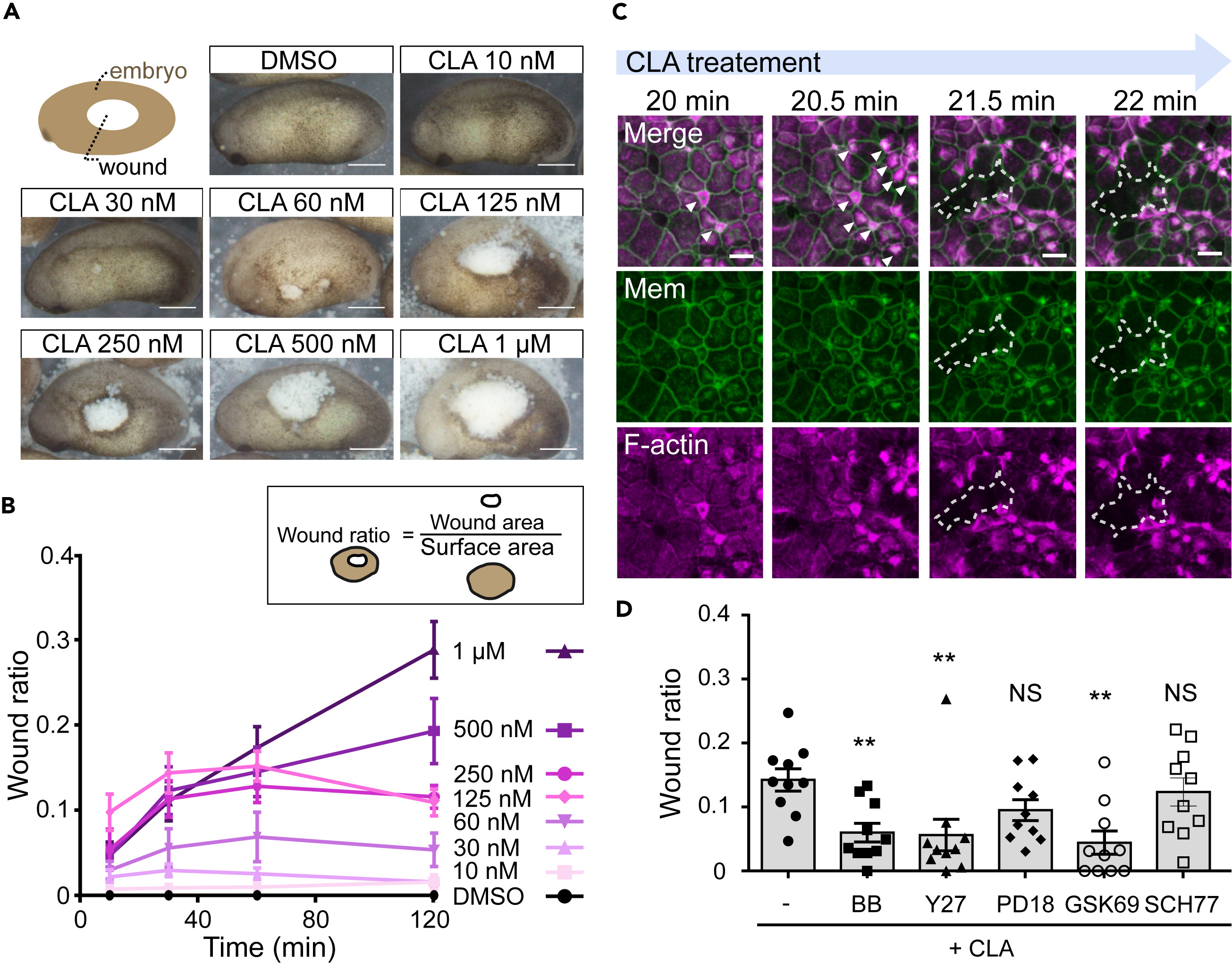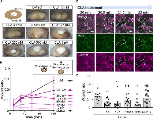 Figure 1. CLA tears the Xenopus embryo epidermis by eliciting hypercontraction of actomyosin (A) Late neurula stage embryos, at 1 h after CLA treatment. The white area on the epidermis is the wound. Scale bar: 0.5 mm. (B) Time-course analysis of the CLA-induced wound area. The wound area was divided by the embryo surface area, to quantify the effects of CLA. Data are represented as mean ± SEM. (C) Still images from live-imaging of the epidermis, at 15–22 min after CLA treatment (1 μM). The embryos expressed LifeAct-RFP (F-actin marker) and a membrane marker. Arrowheads indicate ectopic accumulation of F-actin, while dotted lines indicate the torn area. Scale bar: 20 μm. (D) Wound ratio at 10 min after treatment with inhibitors. Co-treatment with CLA (200 nM) and an actomyosin or kinase-related inhibitor: BB (myosin II inhibitor), 100 μM; Y27 (ROCK inhibitor), 100 μM; PD18 (ERK inhibitor), 10 μM; GSK69 (Akt kinase inhibitor), 1 μM; and SCH77 (ERK1/2 inhibitor), 1 μM. The concentrations used were about IC50 in cell-based assays × 100–500. Scale bar: 0.5 mm. (n = 10, ∗∗p < 0.01, as assessed using one-way analysis of variance, Data are represented as mean ± SEM). (CLA, calyculin A; ROCK, Rho-associated protein kinase; MLCK, myosin light-chain kinase; ERK, extracellular signal-regulated kinase). |