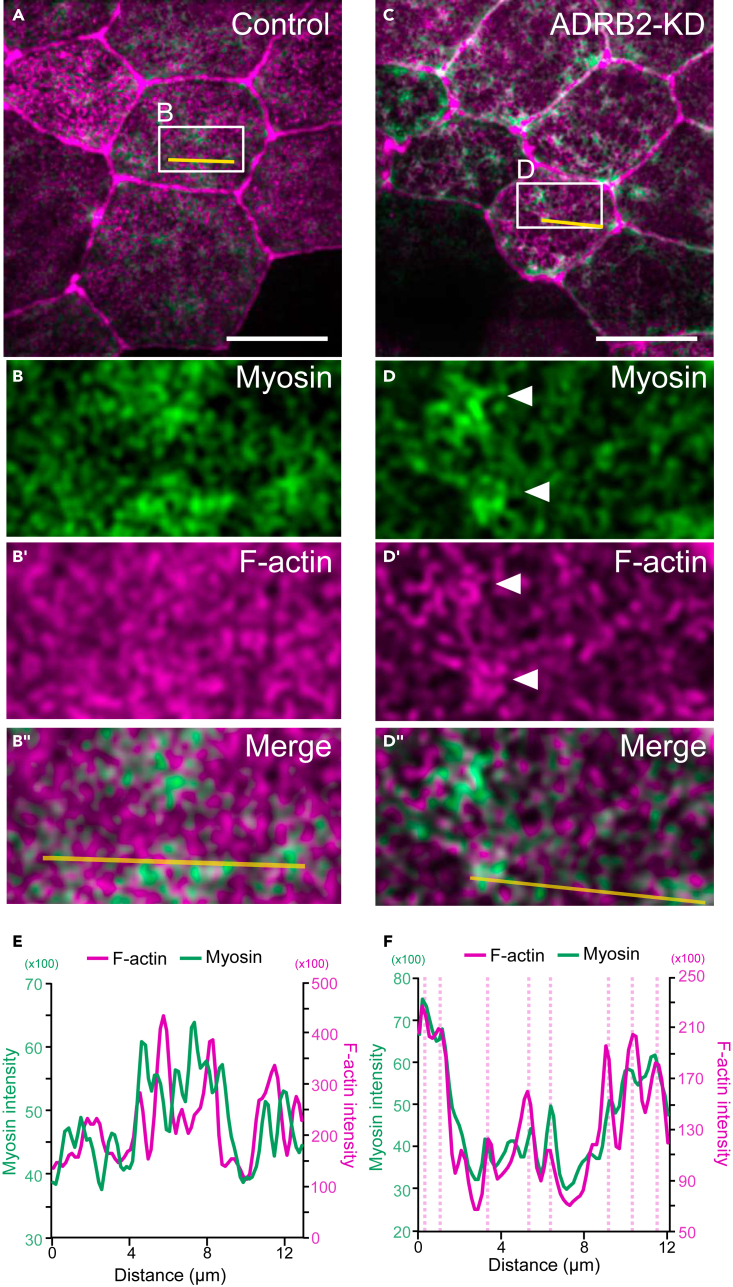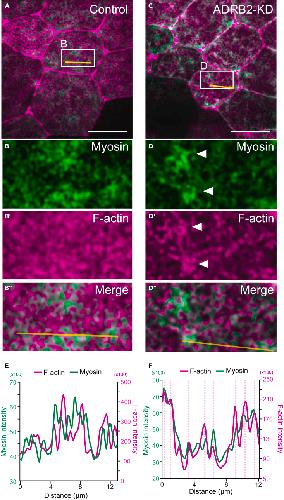 Figure 6. ADRB2 facilitates actomyosin complex on the apical surface of the epidermis(A–D″) Live imaging of the apical surface of the epidermis injected with LifeAct-rfp and SF9-gpf. (A–B')': control embryos; (C–D')': knockdown embryos. Arrowheads indicate excess myosin accumulation in the knockdown embryos. Scale bar: 20 μm.(E and F) Plot profile of raw intensities for LifeAct-RFP and SF9-GFP along the drawn line (yellow) in images (B'') and (D''), respectively. The pink dotted lines in F indicate overlapping peaks between LifeAct-RFP and SR9-GFP. |