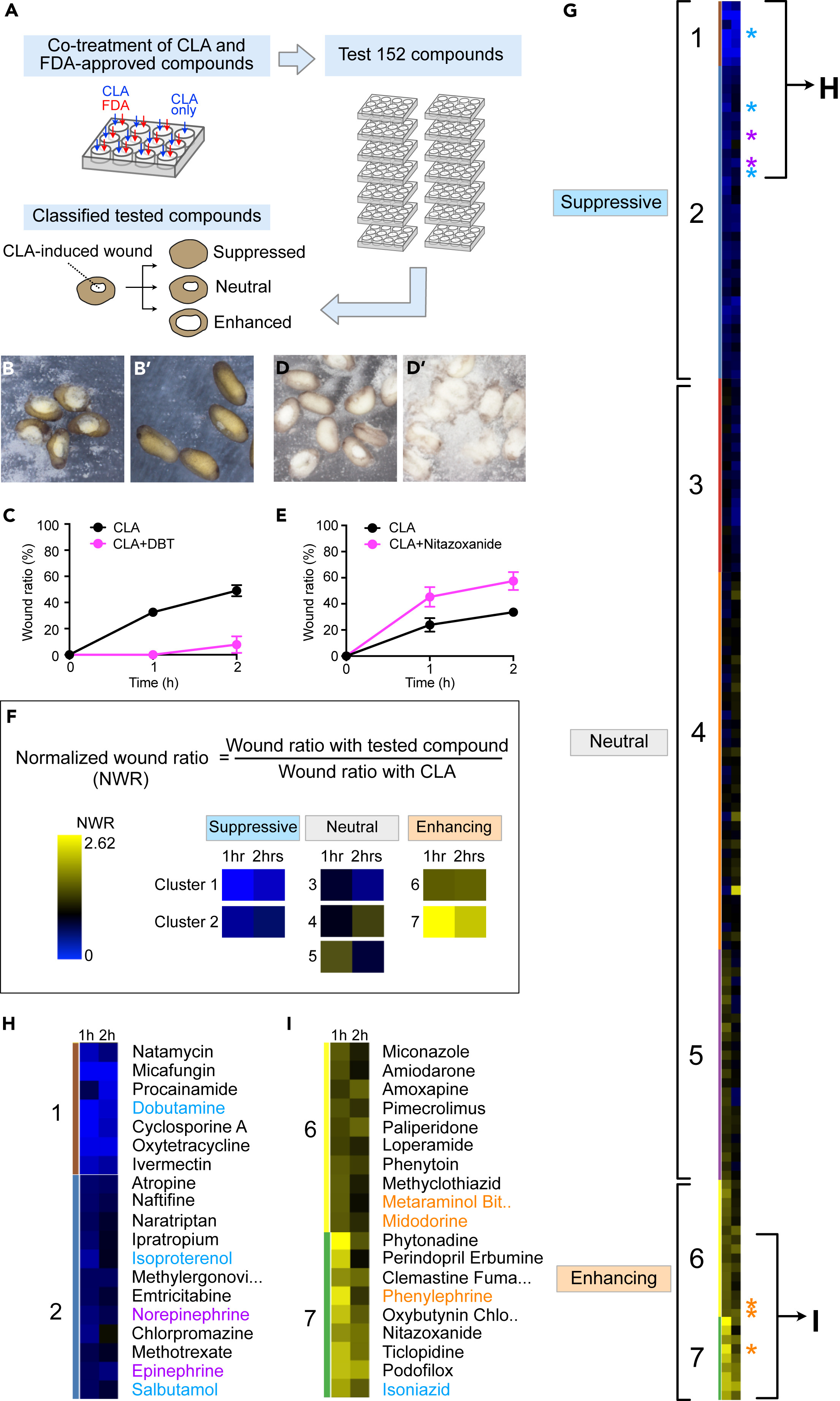 Figure 2. Chemical screening for the detection of adrenergic receptors (A) The screening procedure. Five to ten embryos in each well were treated with CLA and FDA-approved compounds. In the study, 152 compounds were tested and the effect was classified based on the wound size. (B and B') Example compounds classified as suppressive: CLA (B) and CLA and DBT (B'). (C) Wound ratio for embryos shown in B and B', calculated to quantify the suppressive effect of DBT against CLA. (D and D') Example compounds classified as enhancing: CLA (D) and CLA and nitazoxanide (D'). (E) Wound ratio for embryos shown in (D) and (D'). (F) Wound ratio of each FDA-approved compound, normalized to the CLA wound ratio (NWR). NWR values at 1 and 2 h after treatment were converted to heatmap colors using Web MeV (http://mev.tm4.org/). (G) Clustering of compounds based on the heatmap colors. Blue asterisks indicate ADRB agonists; purple asterisks indicate norepinephrine and epinephrine; orange asterisks indicate ADRA agonists. (H) Zoom-in view of Cluster 1 and 2 compounds from (G). (I) Zoom-in view of Cluster 6 and 7 compounds from (G). (Data in C and E are represented as mean ± SEM. CLA, calyculin A; FDA, US Food and Drug Association; NWR, normalized wound ratio; ADRA, alpha-adrenergic receptor; ADRB, beta-adrenergic receptor). |
