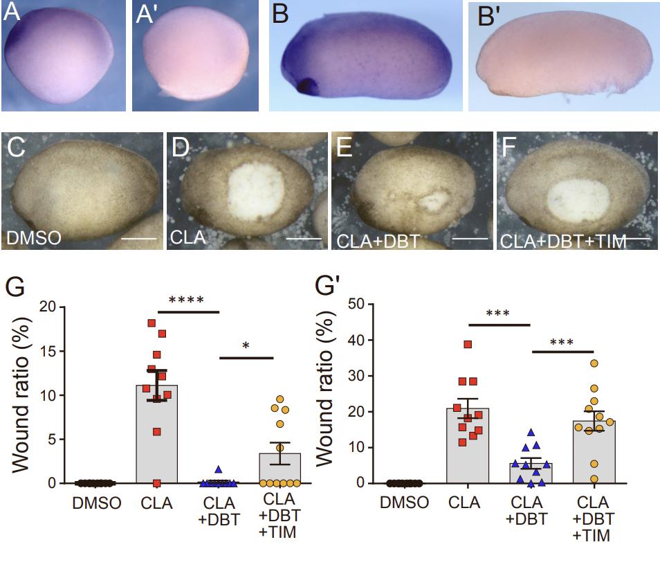 Figure S3. adrb2 RNA is expressed in the epidermis during the stages tested for the chemical screening. Related to Figure 2. (A, A') In situ hybridization of adrb2 (A) and negative control (A') at Stage 14, lateral view. (B, B') In situ hybridization of adrb2 (B) and negative control (B') at Stage 21, lateral view. (C–F) Embryos treated with DMSO, 100 µM (C); CLA, 200 nM (D); CLA (200 nM) and DBT (800 µM) (E); and CLA (200 nM), DBT (800 µM), and TIM (50 µM) (F). The white area represents the wound site. (G, G') Quantification of the wound ratio at 30 (G) and 60 (G') min after treatment (n=9–11, ****p<0.0001, ***p<0.001, *p<0.05, as assessed using one-way analysis of variance; Scale bar: 500 µm). Data are represented as mean +/- SEM. (DBT, dobutamine; DMSO, dimethyl sulfoxide; CLA, calyculin A) |