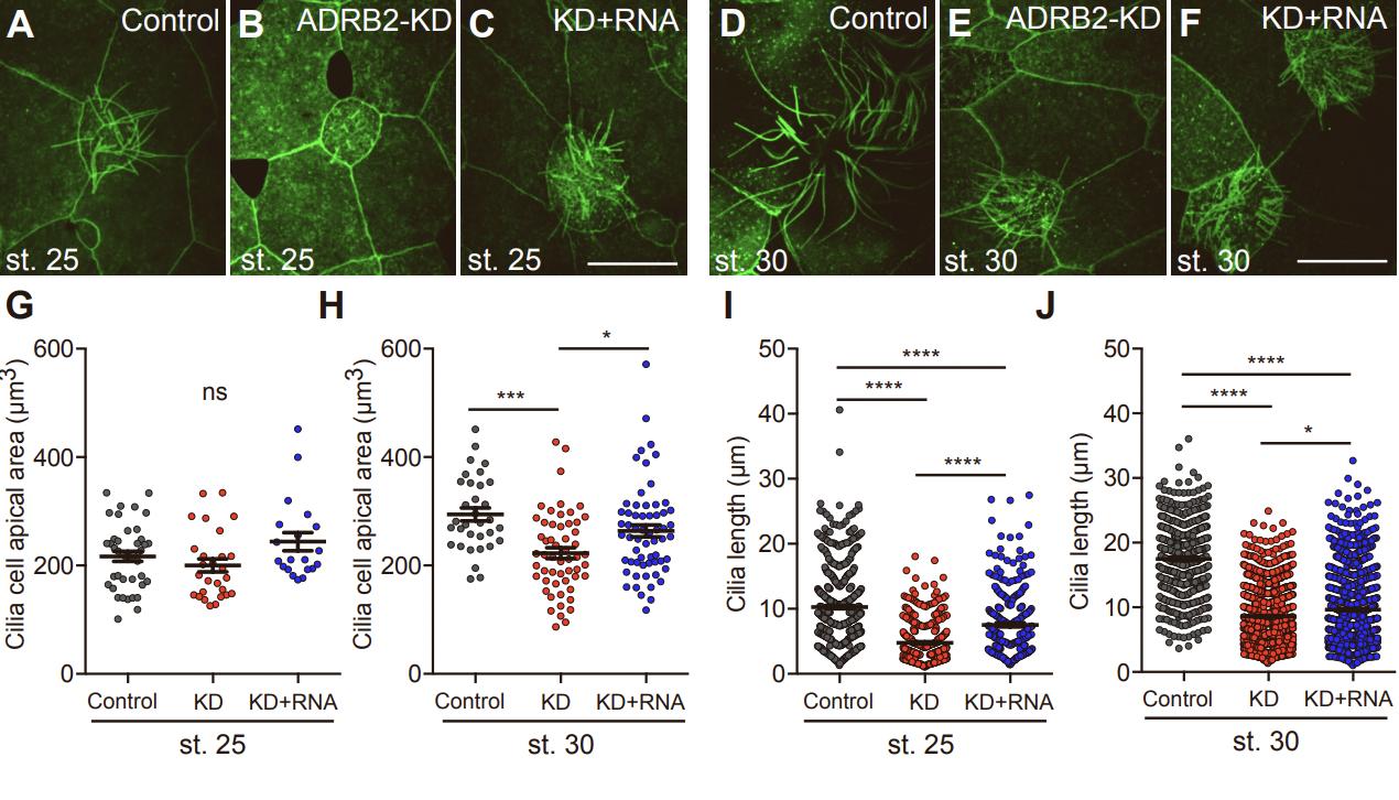Figure S4. ADRB2 is required for normal ciliated cell insertion and ciliogenesis. Related to Figure 4. (A–F) Live-imaging of membrane-GFP in the epidermis at stages 25 (A: control-MO injected, B: adrb2-MO injected, C: adrb2-MO and adrb2-5mis RNA injected) and 30 (D: control-MO injected, E: adrb2-MO injected, F: adrb2-MO and adrb2-5mis RNA injected). Scale bar: 20 µm. (G, H) Measurement of the apical cell area of ciliated cells at stages 25 (G) and 30 (H). (*p=0.036, ***p=0.0001, one-way analysis of variance) (I, J) Quantification of cilia length at stages 25 (I) and 30 (J). (****p<0.0001, *p=0.0154, one-way analysis of variance). Data are represented as mean +/- SEM. |