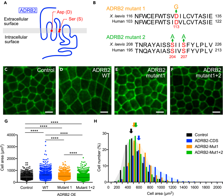 Figure 7. ADRB2 requires ligands to expand apical cell area (A) Prototypic model of ADRB2. Red circles indicate residues involved in ligand binding (Asp: aspartic acid, Ser: serine). (B) Mutant ADRB2s used in the experiments. Upper is mutant 1, where Asp has been replaced by Gly. Lower is mutant 2, where Ser has been replaced by Ala. These mutations are established in human ADRB2. (C–F) Live imaging of the membrane-GFP expressing epidermis of control (only endogenous ADRB2), co-expressing WT ADRB2 (300 pg), mutant 1 ADRB2 (300 pg), and mutant 2 ADRB2 (300 pg). (G) Quantification and (H) distribution of apical cell area in each group. Arrows indicate the peak of each group. ADRB, beta-adrenergic receptor; WT, wild-type (control: n = 3851 cells from 8 embryos, WT adrb2: n = 2099 cells from 6 embryos, mutant 1: n = 3873 cells from 8 embryos, mutant 2: n = 5533 cells from 8 embryos, ∗∗∗∗p < 0.0001, as assessed using one-way analysis of variance) Data in H are represented as mean ± SEM. Scale bar: 20 μm. |