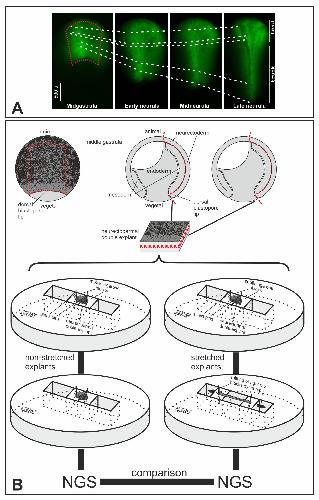 Figure 3. Convergent extension of the neurectoderm and schema of experiments in finding of genes regulated by mechanical tensions. (A) Photos of FLD-injected neural plate at different successive stages of development. White dashed lines connect at different stages the same noticeable features at the embryo surface. The red dashed line on the image of the midgastrula embryo indicates the approximate border of the neuroectodermal explants which had been excised at this stage. (B) Schema of experiments of explants stretching followed by NGS (see main text for details). Red dashed lines indicate the boundaries of the explants. |
