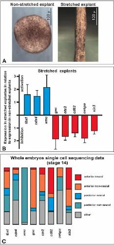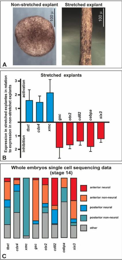 Figure 4. Analysis of the influence of the neuroectodermal explants stretching on gene expression. (A) Examples of explants nonstretched and stretched according to the schema shown in Figure 3B. (B) Genes whose expression changed in the explants upon the stretching, according to qRT-PCR data. Bars indicate the standard deviation. (C) Percentage expression distribution of selected MT-responsive genes in the indicated on the right groups of cells in midgastrula embryo (stage 14) according to the Jamboree single-cell sequencing database [24]. The group anterior neural includes such cell types as anterior neural plate; the group anterior non-neural includes such cell types as anterior placodal area, cement gland primordium, eye primordium, and anterior neural crest; the group posterior neural includes such cell types as posterior neural plate; the group posterior non-neural includes such cell types as presomitic mesoderm, somite, and tail bud; the group other includes other cell types (see Xenopus single-cell transcriptomic data analysis in Section 4.6 for details). |