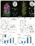 Figure 2. Morphometric analysis of tissue deformation. (A,B) To evaluate tissue deformation, we performed time-lapse imaging of cells in head (A) and trunk (B) regions of st. 14–15 Xenopus neurula during a 20 min interval. Insets in the right row show the position of segmented regions (enclosed with white dashed line) on scheme (A′,B′) and in imaged embryos (A″,B″) under lower magnification. Cell trajectories in (A,B) are color-coded: yellow–green indicates the initial part of the trajectory, blue—central, purple–red—terminal. (C,D) Tissue-level deformation evaluated by shape change of integral ROI including all segmented cells. Green and red counters reflect ROI shape at the first and last frame, respectively, of the time-lapse sequence. Individual trajectories of selected cells are visualized as black lines; arrows indicate direction of cell displacements inside ROIs. (C′,D′) and (C″,D″): To quantitatively describe spatial distribution of cell displacements underlying ROI deformation presented in (C,D), we calculated cosine of the angle between anteroposterior axis and direction of each cell displacement during two initial (C′,D′) and two terminal (C″,D″) frames in sequence and plotted this cosine value against ordinate (in pixels). We denote 0° (360°) displacement angle as shift towards anterior pole, and 180°—towards posterior. Thus, cosine values close to 1 indicate displacement towards the anterior pole, and values close to −1—towards the posterior pole. Note the marked translational shift of ROI in the head region without significant elongation on the contrary to the trunk region, that mostly remained in the field of view and was subjected to bidirectional ((D″) black dotted boxes) elongation. (E,F) To estimate cellular shape changes underlying observed ROI deformations, we analyzed distribution of cell eccentricities (E) for head (Nembryos = 1, ncells = 136) and trunk (Nembryos = 1, ncells = 56) regions at the start (blue) and the end (grey) of time-lapse series as well as area changes (F) of cells (blue) and small ROIs, including 10–11 cells (gray); columns show mean, whiskers—95% confidence interval. Inset in (E) (reprinted under Creative Commons 3.0 license) shows typical cell and respective ellipse shape for eccentricity = 0.6 and for eccentricity = 0.8. Note the slight (but statistically significant) increase in mean eccentricity in the trunk region while the apical cell area remains the same, reflecting cell elongation in the trunk region. At the same time, mean eccentricity in the head region did not change, while the apical cell area decreased, reflecting apical constriction. |