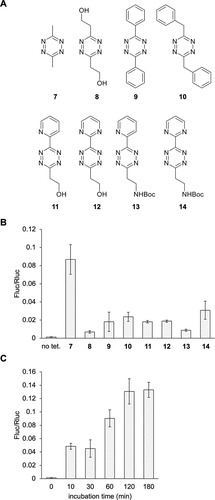 Figure 4. Conditional control of enzymatic activity through the incorporation of 4. (A) Chemical structures of the different tetrazines tested for decaging of 4 in vivo. (B) Tetrazine screen of dual-luciferase reporter activation. (C) Tetrazine 7 incubation timecourse. Bars represent mean, and error bars represent standard deviation of measurements from three independent embryos. No tet = no tetrazine control. |