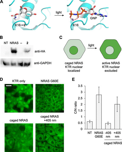 Figure 6. Optical control of NRAS activity using photocaged lysine 2. (A) Structural representation of caging of the NRAS active site with 2 (PDB: 5UHV). (B) Western blot of incorporation of 2 into NRAS. (C) Caging of NRAS blocks its activity in the absence of light, and the ERKKTR-Clover reporter is nuclear localized. Irradiation at 405 nm activates NRAS, which leads to ERK activation and nuclear exclusion of the KTR. (D) Representative confocal images of the KTR reporter for each condition. Scale bar: 20 μm. (E) Quantification of the fluorescent cytosol/nucleus ratio. Bars represent means, and error bars represent standard deviations of measurements from 15 cells and three different embryos. |