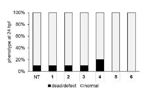 Figure S3. Toxicity assay of UAAs 1-6 in xenopus embryos measured at 24 hpf. A volume of 5 nl of a 10 mM solution of UAAs 1, 2, 4, and 5 were injected and embryos were incubated at 23 °C for 24 hours. For UAA 3, embryos were incubated at 23 °C in embryo media supplemented with 0.25 mM of 3. For UAA 6, embryos were incubated at 23 °C in embryo media supplemented with 1 mM of 6. N = 10 for each condition. |
