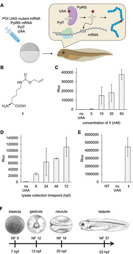 Figure 1. Genetic code expansion in Xenopus. (A) Injection and UAA incorporation into a protein of interest (POI) in embryos. (B) Structure of 1. (C) Titration of 1 in the injection solution and incorporation into Rluc95UAG. (D) Incorporation of 1 (10 mM) over the first 72 h of development. (E) Incorporation of 1 into Rluc95UAG at 16 °C. All bars are means, and error bars are standard deviations from three embryos. (F) Nieuwkoop Faber (NF) stages of Xenopus embryos at certain time points at 23 °C. Panel F reproduced with permission from ref (37). Copyright 2022 The Company of Biologists. NT = nontreated embryo control. hpf = hours post-fertilization. |