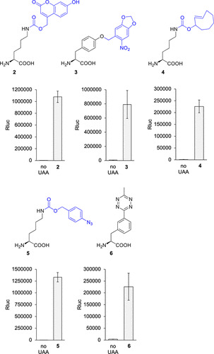 Figure 2. Genetic encoding of UAAs 2–6 in Xenopus embryos. Structures of 2–6. Blue represents caging groups that are removed after treatment with 405 nm light or a small molecule trigger. Incorporation of 2–6 into the luciferase reporter was accomplished after injection of all components, including 2, 4, and 5, while UAAs 3 and 6 were added to the media. Embryos were incubated at 23 °C, and assays were conducted at 24 hpf. Bars represent means, and error bars represent standard deviations of measurements from three independent embryos. |