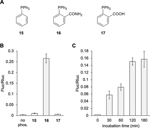 Figure 5. Conditional control of enzymatic activity through phosphine-based decaging of 5 incorporated into protein. (A) Chemical structures of the different phosphines tested. (B) Phosphine screen of dual-luciferase reporter activation. (C) Incubation timecourse with 16. Bars represent mean, and error bars represent standard deviation of measurements from three independent embryos. No phos. = no phosphine control. |