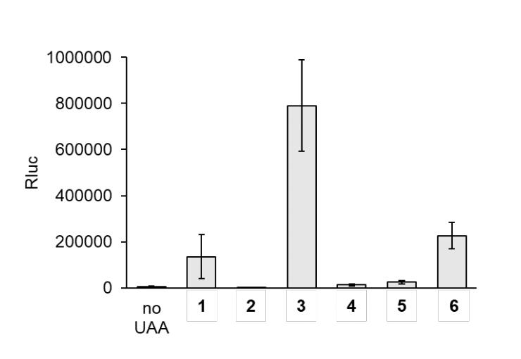 Figure S2. Luciferase assays after addition of UAAs to embryo media. UAAs were added to Xenopus embryo media at a 1 mM final concentration (0.25 mM for 3) after injection of the Rluc95UAG mRNA, PylRS mRNA, and PylT. Embryos were incubated at 23 °C and assays were conducted at 24 hpf. |