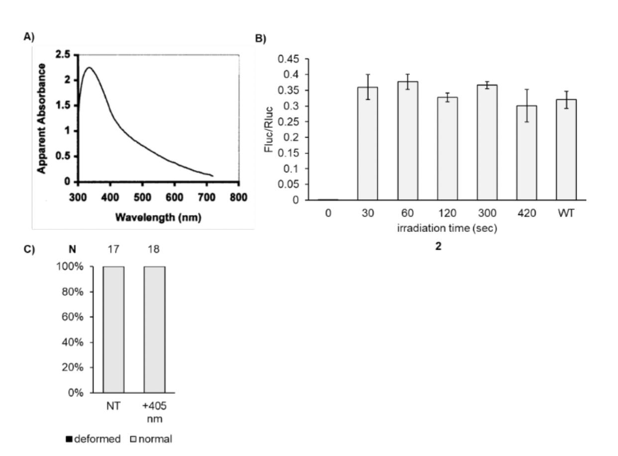 Figure 3. Conditional control of enzymatic activity with photocaged UAAs 2 and 3. (A) Luciferase enzymatic activation in Xenopus embryos with light. Structural representation of caging of the Fluc active site with either (B) 2 or (D) 3 before and after irradiation (PDB: 4G36). Incorporation of (C) 2 or (E) 3 into the dual luciferase reporter and irradiation for increasing duration with a 405 nm light at 24 hpf. Bars represent means, and error bars represent standard deviations of measurements from three independent embryos. |