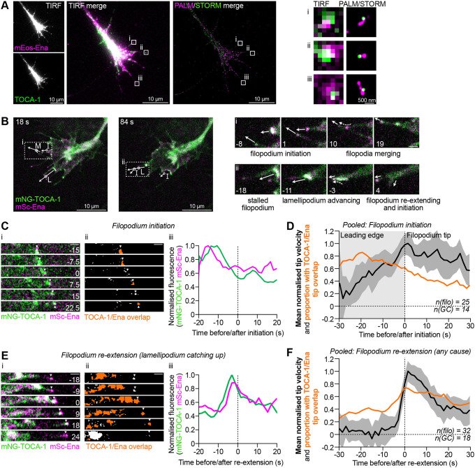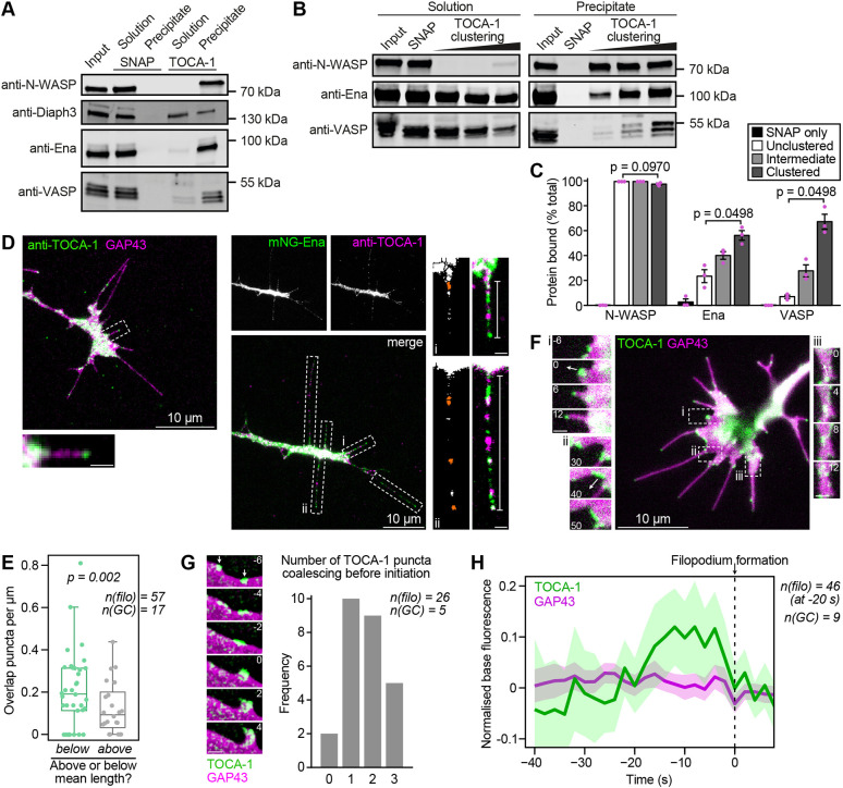 Filopodia are narrow actin-rich protrusions with important roles in neuronal development where membrane-binding adaptor proteins have emerged as upstream regulators that link membrane interactions to actin regulators, for example I-BAR and F-BAR domain-containing proteins interacting with Ena/VASP and formins. To explore the significance of the F-BAR neuronal membrane adaptor TOCA-1 in filopodia we used quantitative analysis of TOCA-1 and filopodial dynamics in Xenopus retinal ganglion cells, where Ena/VASP proteins have a native role in filopodial extension. Both the adaptors and their binding partners are part of diverse and redundant protein networks that can functionally compensate for each other. Increasing density of TOCA-1 enhances Ena/VASP binding in vitro and an accumulation of TOCA-1, and its coincidence with Ena, correlates with filopodial protrusion in vivo. Two-colour single molecule localisation microscopy of TOCA-1 and Ena supports their nanoscale association. TOCA-1 clusters promote filopodial protrusion depending on a functional SH3 domain and activation of Cdc42, which we perturbed using small molecule inhibitor CASIN. We propose that TOCA-1 clusters act independently of membrane curvature to recruit and promote Ena activity for filopodial protrusion.