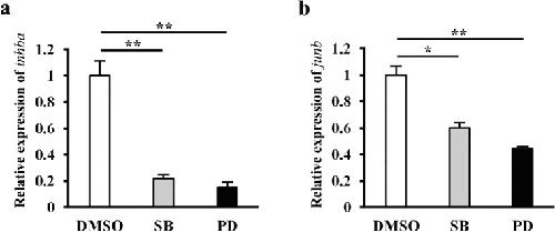 Figure 1. The expression of inhba and junb is regulated by injury-activated signaling during wound healing. qRT-PCR analysis of inhba (a) and junb (b) expression in DMSO (control), SB-505124 (SB), and PD0325901 (PD)-treated tails. The regenerating tails were isolated at 1 and 2 hpa for the expression of junb and inhba, respectively. The data were normalized against expression of rps18, and then by the value of DMSO. *P < 0.05, **P < 0.01.