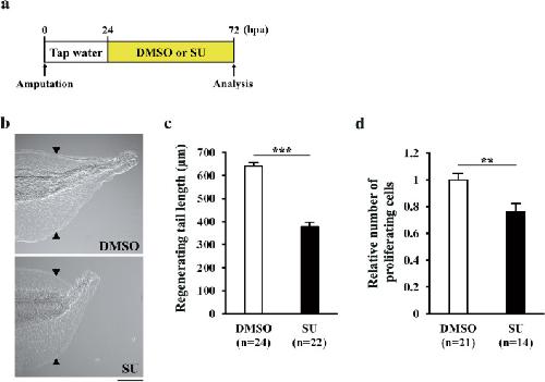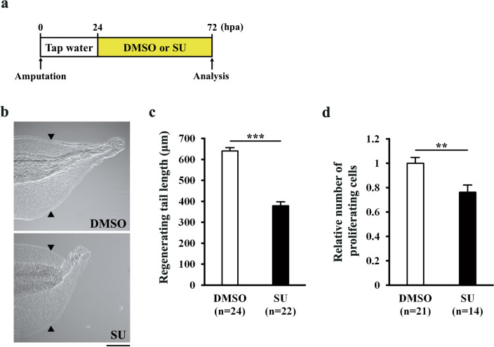 Figure 6. FGF signaling is required for regenerative outgrowth/cell proliferation. (a) Schematic of the experimental plan. Tadpoles were incubated in water containing 0.0375% DMSO (control) or 15 μM SU5402 (SU) from 24 hpa and analyzed at 72 hpa for regenerating tail length and proliferating cells. (b) Representative phenotypes of DMSO and SU-treated tadpoles at 72 hpa. (c) The lengths of regenerating tails at 72 hpa. (d) Relative number of proliferating cells at 72 hpa. The number of pH3-positive cells was divided by the corresponding area. In (b) and (c), the photograph and length of regenerating tails were obtained after whole-mount immunostaining, which involves bleaching and methanol treatments. Due to these treatments, the measured regenerating tail length is relatively shorter than in other experiments. All values were normalized against the value of DMSO-treated tadpoles. Black arrowheads indicate amputation sites. Scale bar, 200 μm. **P < 0.01, ***P < 0.001.