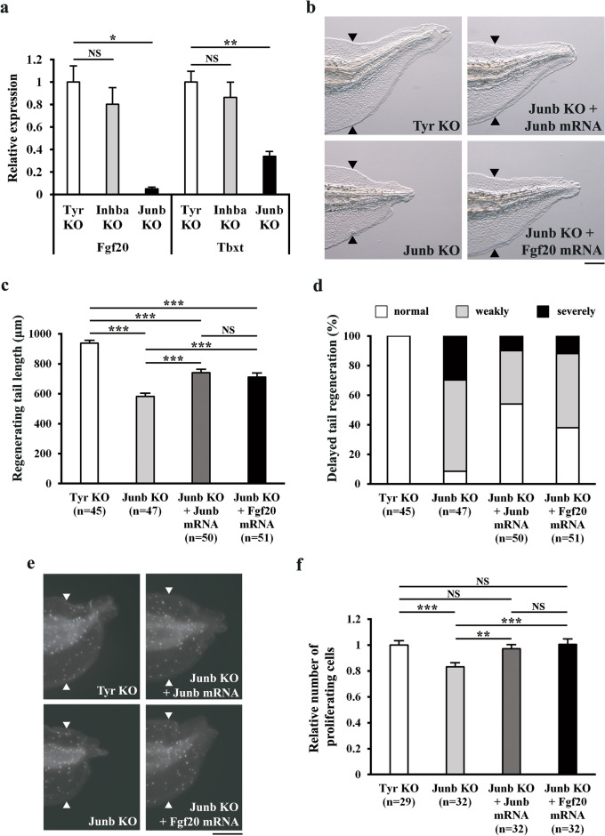 Figure 5. JunB regulates regenerative outgrowth/cell proliferation via FGF signaling. (a) Relative expression of fgf20 and tbxt in inhba KO and junb KO tadpoles at 36 hpa. The data were normalized against the expression of rps18, and then by the value of tyr KO. (b) Representative phenotypes of tyr KO (control), junb KO, junb KO + junb mRNA, and junb KO + fgf20 mRNA tadpoles at 72 hpa. (c) The lengths of regenerating tails in KO tadpoles at 72 hpa. (d) Summary of phenotypes in KO tadpoles at 72 hpa. On the basis of the lengths of regenerating tails at 72 hpa, tadpoles were classified into three phenotypic groups (normal regeneration, weakly delayed regeneration, or severely delayed regeneration). (e) Representative immunofluorescent images of pH3 staining (white dots) in tyr KO (control), junb KO, junb KO + junb mRNA, and junb KO + fgf20 mRNA tadpoles at 36 hpa. (f) Relative number of proliferating cells at 36 hpa. The number of pH3-positive cells was divided by the corresponding area. All values were normalized against the value of tyr KO. Black and white arrowheads indicate amputation sites. Scale bars, 200 μm. NS, not significant; *P < 0.05, **P < 0.01, ***P < 0.001.