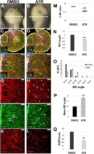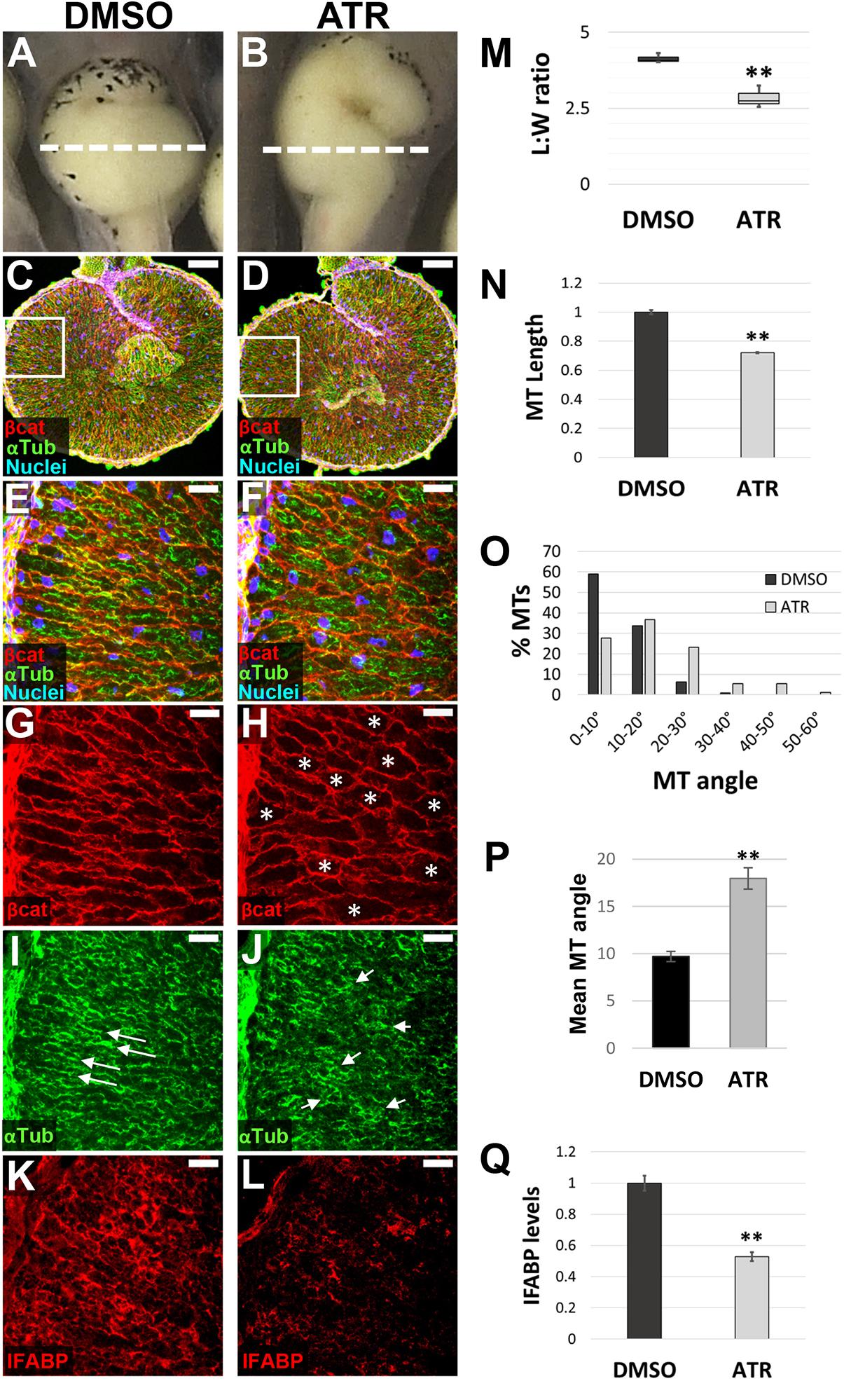 Fig. 2. ATR inhibits endoderm cell properties required for early intestine elongation. (A-Q) Transverse sections through the intestine of NF 42 control (DMSO; A,C,E,G,I,K) and ATR-exposed (B,D,F,H,J,L) embryos were immunostained for Beta-catenin (red; C-H) to outline cell membranes, alpha-tubulin (green; C-F,I,J) to visualize MT bundles, and IFABP (red; K,L) to mark differentiated intestinal epithelial cells. Nuclei (TO-PRO-3) are blue. Dashed lines in A,B indicate the approximate location of DMSO and ATR sections. Boxed regions in C and D are shown at higher magnification in E,G,I and F,H,J, respectively, and approximate the locations of K and L, respectively, in neighboring sections. Note that the control image shown in C is the same as that displayed in Fig. 6A. Cells of ATR-exposed intestines are rounder in shape (G,H, asterisks), as indicated by decreased L:W ratios of individual cells (M), and have short (N), misoriented MT bundles (I,J, arrows; quantified in O,P) and low levels of IFABP (K,L,Q), compared with DMSO controls. Error bars represent s.e.m. **P<0.01 (two-sample t-test). Scale bars: 100um (C,D); 25um (E-L). |