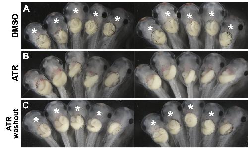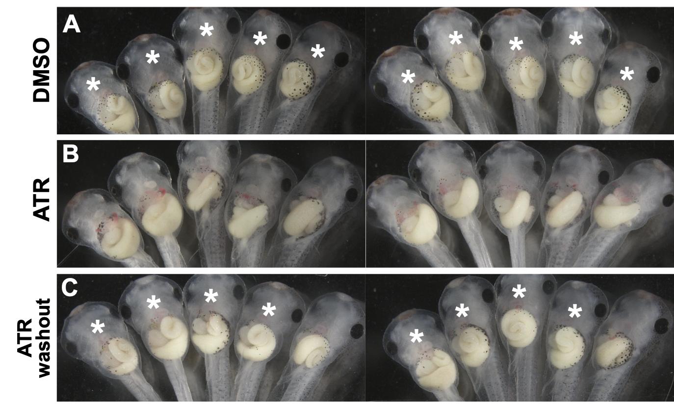 Fig. S2. Removing ATR after initial exposure rescues intestinal shortening and malrotation. DMSO control embryos develop elongated intestines that are normally rotated (indicated by *; A), while embryos exposed to chronic ATR exposure develop intestines that are both short and malrotated (B). C) Most embryos in which ATR was washed out prior to formation of the hairpin loop (by NF 42-43) exhibit greater intestine length and normal CCW rotation. Results were replicated in at least three independent experiments with 8-10 embryos each. Cropped areas from A and B are shown in Fig. 8A and B, respectively. |
