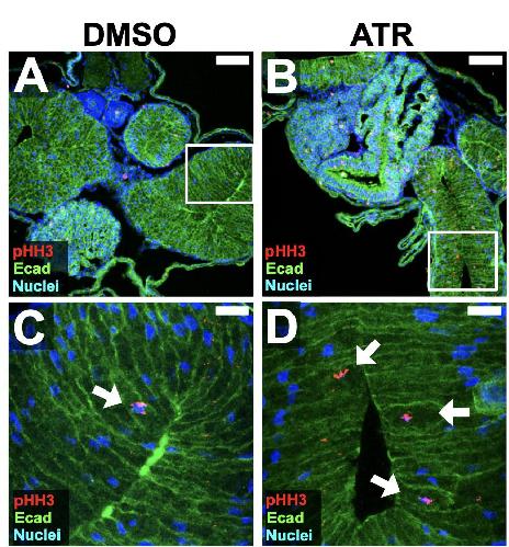 Fig. S4. ATR increases mitosis and apoptosis.[panels A-D] Transverse sections through the intestine of NF 44 DMSO control and ATR-exposed embryos were immunostained for E- cadherin (Ecad, green; A-H) to visualize cell membranes, phosphohistone-H3 (pHH3, red; A-D) to identify mitotic cells, and caspase-3 to identify apoptotic cells (red; E-H). Boxed regions in A-B and E-F are shown at higher magnification in C-D and G-H, respectively. ATR-exposed intestines have a greater number of mitotic cells at the apical surface of the epithelium (compare C and D, arrows). Compared to controls (E, G) ATR-exposed intestines also have apoptotic cell debris within the lumen (F, H), as indicated by caspase staining (quantified in I). Nuclei are blue (TO-PRO-3). Error bars represent SE. *p<0.05. Scale bars in A-B and E-F = 100 μm. Scale bars in C-D = 25 μm. Scale bars in G-H = 50 μm. |