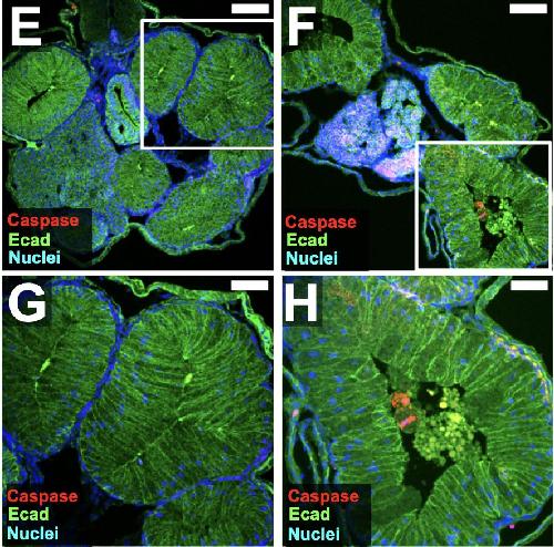 Fig. S4. ATR increases mitosis and apoptosis. [panels E-H] Transverse sections through the intestine of NF 44 DMSO control and ATR-exposed embryos were immunostained for E- cadherin (Ecad, green; A-H) to visualize cell membranes, phosphohistone-H3 (pHH3, red; A-D) to identify mitotic cells, and caspase-3 to identify apoptotic cells (red; E-H). Boxed regions in A-B and E-F are shown at higher magnification in C-D and G-H, respectively. ATR-exposed intestines have a greater number of mitotic cells at the apical surface of the epithelium (compare C and D, arrows). Compared to controls (E, G) ATR-exposed intestines also have apoptotic cell debris within the lumen (F, H), as indicated by caspase staining (quantified in I). Nuclei are blue (TO-PRO-3). Error bars represent SE. *p<0.05. Scale bars in A-B and E-F = 100 m. Scale bars in C-D = 25 m. Scale bars in G-H = 50 m. |