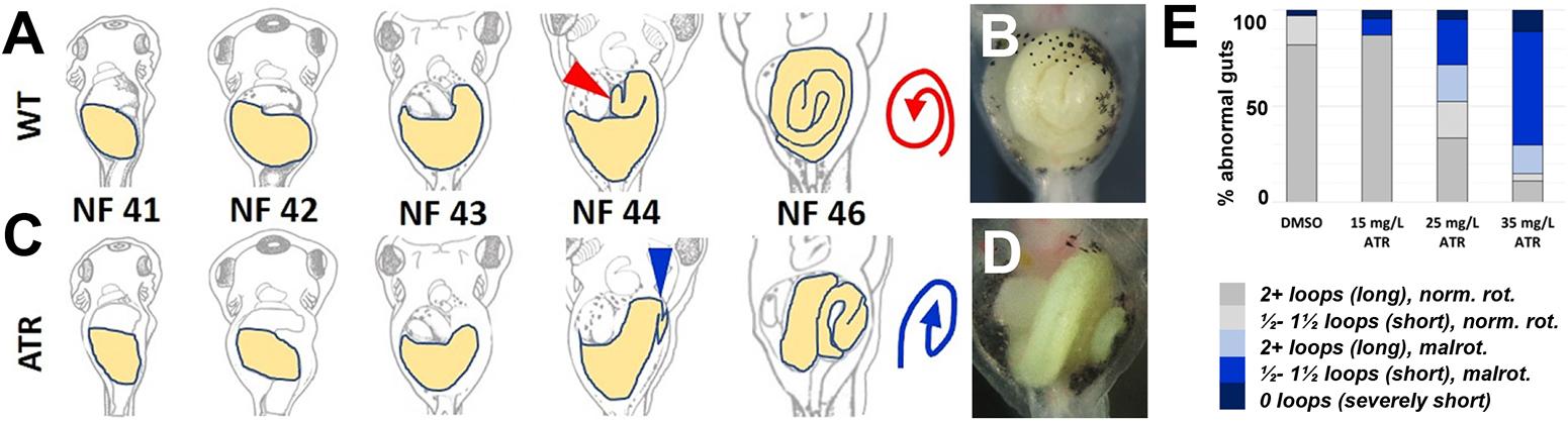 Fig. 1. Exposure to atrazine causes intestinal shortening and malrotation. (A,C) Schematics illustrating normal counterclockwise (CCW) intestine rotation in wild-type (WT) Xenopus embryos (A), and the abnormal clockwise (CW) malrotation seen in ATR-exposed embryos (C). The midgut (future intestine) is yellow. Red (WT) and blue (ATR) arrowheads indicate the intestinal apex (NF 44, establishes the initial direction of rotation), and red (WT) and blue (ATR) spirals illustrate the final rotation direction of the intestinal coil (NF 46). (B,D) In situ stereo-microscope images of DMSO or ATR-treated NF 46 intestines (ventral view). DMSO control embryos develop elongated intestines that rotate normally (B), whereas ATR-exposed embryos develop intestine coils that are both short and malrotated (D). (E) The frequency of abnormal gut phenotypes increases with increasing concentrations of ATR, from predominantly normal (norm.) length (2+ intestine loops) and CCW rotation (rot.) to increasingly short (1.5 or fewer intestine loops) and/or CW malrotated (malrot.) configurations. |