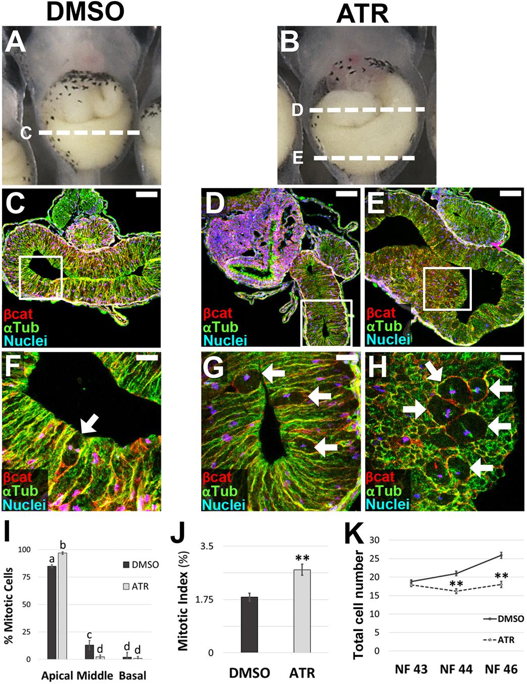 Fig. 3. ATR inhibits epithelial proliferation during late intestinal elongation. (A-K) Transverse sections through the intestine of NF 44 control (DMSO; A,C,F) and ATR-exposed (B,D,E,G,H) embryos were immunostained for -catenin (red; C-H) to outline cell membranes and -tubulin (green; C-H) to visualize MT bundles. Nuclei/chromosomes (TO-PRO-3) are blue. Dashed lines in A,B indicate the approximate location of the sections shown in C-E, with the boxed regions in C-E shown at higher magnification in F-H, respectively. Mitosis occurs almost exclusively near the apical surface of the epithelium in both control and ATR-exposed intestines (arrows, F-I). However, ATR-treated guts have even more apically localized mitotic figures (I), and an increased number of mitotic cells overall, compared with controls (J), including dense clusters of mitoses (E,H). Although total cell number increases over time (NF 43-46) in control intestines, this parameter does not change in ATR-exposed intestines (K). Error bars represent s.e.m. **P<0.01 (I,K, two-sample t-test; J, one-way ANOVA with post-hoc Tukey's HSD). Significant differences in I are indicated by distinct lowercase letters (P<0.01). Scale bars: 100m (C-E); 25m (F-H). |
