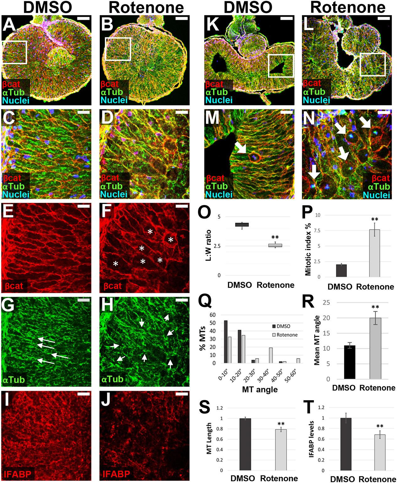 Fig. 6. Inhibiting mitochondrial ETC complex I by rotenone phenocopies ATR. (A-T) Transverse sections through the intestine of NF 42 (A-J) and NF 44 (K-N) DMSO control (A,C,E,G,I,K,M) and rotenone-exposed (B,D,F,H,J,L,N) embryos were immunostained for -catenin (red; A-F,K-N) to outline cell membranes and -tubulin (green; A-D,G,H,K-N) to visualize MT bundles. IFABP (red; I,J) was used as a marker of differentiated intestinal epithelia. Nuclei, blue (TO-PRO-3). Boxed region in A approximates the locations of C,E,G,I in neighboring sections; boxed region in B is shown at higher magnification in D,F,H, and approximates the location of J in a neighboring section. Note that the control image shown in A is reproduced from Fig. 2C. Boxed regions in K,L are shown at higher magnification in M,N, respectively. Compared with DMSO controls, the endoderm cells of rotenone-exposed intestines are rounder in shape (E,F, asterisks), as indicated by decreased L:W ratios of individual cells (O). They also exhibit abnormal polarity, indicated by disoriented and shorter MT bundles (G,H, arrows; quantified in Q-S). In addition, rotenone-exposed cells exhibit lower levels of IFABP (I,J,T), compared with DMSO controls. Finally, rotenone exposure increases the percentage of mitotically arrested cells at NF 44 (M,N, arrows); quantified by pHH3 staining (P). Error bars represent s.e.m. **P<0.01 (two-sample t-test). Scale bars: 100m (A,B,K,L); 25m (C-J,M,N). |