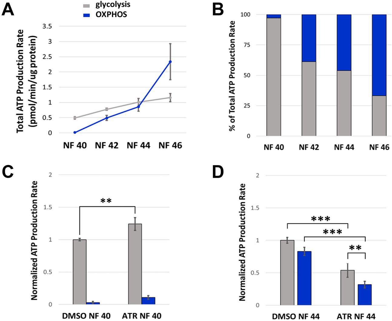 Fig. 7. A metabolic transition is required for intestine morphogenesis. (A,B) Glycolytic (gray) and mitochondrial (OXPHOS; blue) ATP production rates were measured in control embryos and represented as average levels of ATP production (A) and percent of total ATP production (B) by each pathway. (A) Glycolysis is the predominant pathway for energy production until NF 44, when mitochondria in differentiated epithelia begin to produce nearly equivalent levels of ATP. Subsequently (NF44+), OXPHOS becomes the predominant energy production pathway. (B) At early stages (NF 40), only 3% of ATP comes from mitochondrial processes; however, by NF 46 OXPHOS is the predominant source of ATP (67%). (C) Exposure to ATR increases the glycolytic ATP production rate at early stages (NF 40). (D) At later stages (NF 44), although chronic ATR exposure dampens the rate of energy production by both pathways, glycolysis remains the predominant source of energy in ATR-exposed embryos, producing ATP at almost twice the rate of OXPHOS. All results are from at least three independent experiments with 15-30 embryos each. Error bars represent s.e.m. **P<0.05, ***P<0.01 (one-way ANOVA with post-hoc Tukey's HSD). |