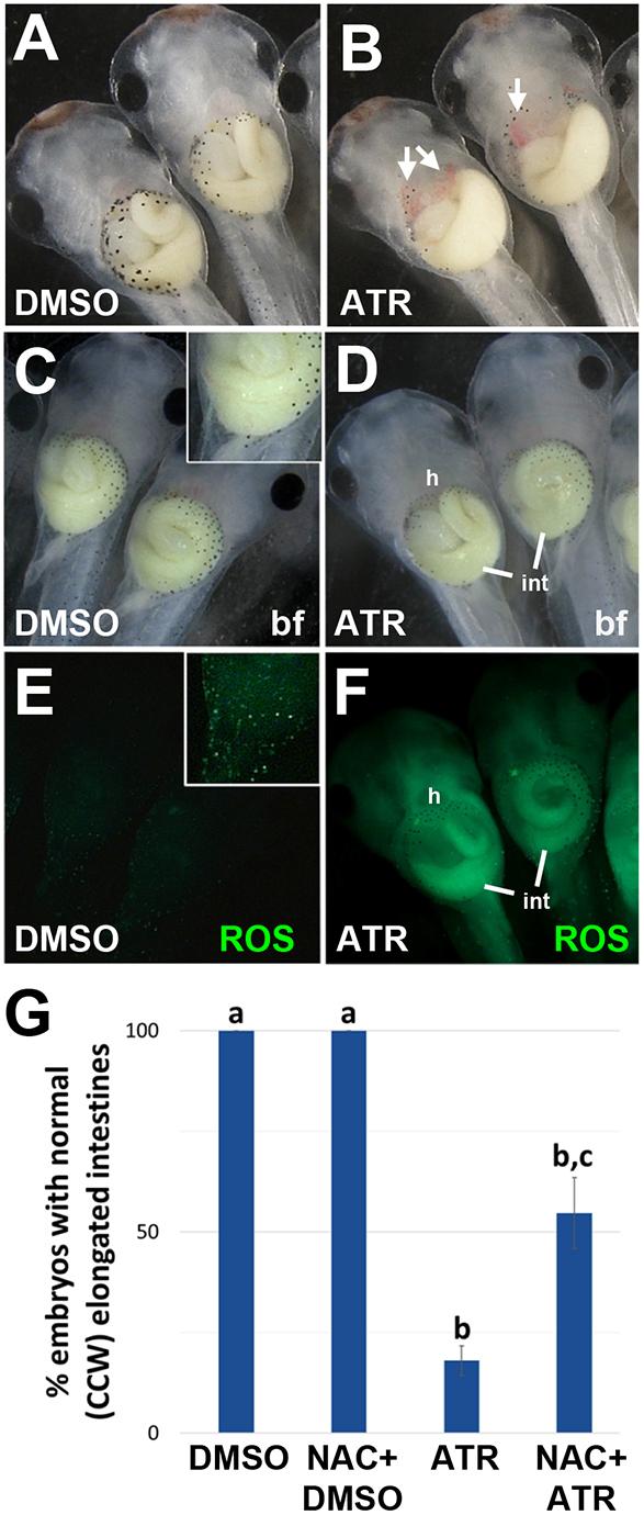 Fig. 8. ATR-induced elongation and rotation defects are rescued by antioxidant pretreatment. (A,B) Compared with DMSO controls (A), ATR-exposed embryos (B) exhibit visceral hemorrhaging (arrows, B), a sign of oxidative stress. The images in A and B show cropped areas of Fig. S2A and B, respectively. (C-F) Embryos were incubated in DMSO or ATR for 30 min before the addition of a green fluorescent ROS detector (H2DCFDA). After 2h, embryos were visualized with brightfield (bf; C,D) or fluorescent (E,F) optics. Compared with DMSO controls (E), ATR-exposed embryos (F) exhibit significantly increased (P<0.01, one-way ANOVA with post-hoc Tukey's HSD) levels of reactive oxygen species (ROS, green), particularly in the intestine (int) and in the vasculature near the heart (h). Insets in C and E (at higher exposure) reveal individual ROS-positive cells in the normal epidermis. (G) Pretreating embryos with an antioxidant (NAC) does not affect normal gut morphology in DMSO controls, but rescues both the elongation and rotation defects caused by ATR (see also Fig. S7). Antioxidant rescue was quantified by measuring the percentage of guts in each condition with 2+ intestinal coils and normal (CCW) rotation direction; significant differences between treatment groups are indicated by distinct lowercase letters (P<0.01, one-way ANOVA with post-hoc Tukey's HSD). All results are from at least three independent experiments with 8-15 embryos each. |