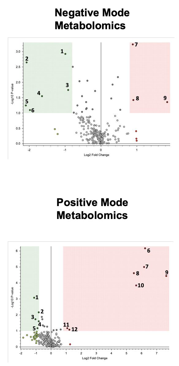 Fig. S5. Metabolite changes in intestines exposed to ATR. Volcano plots show the statistically-significant altered compounds (shaded area: p-value ≤ 0.1 and Log2 FC ≥ 0.8 or ≤ -0.8) in the ATR-treated group vs the DMSO-control group. Dots represent features that were downregulated (green), upregulated (red) or had no observed difference (gray). Data were filtered to remove features with Pooled QC Areas >30% RSD, Annotation ΔMass outside ±2 ppm and no MS2-based annotations. Corresponding tables list the significantly altered compounds annotated at confidence levels 1-3 as described by Schymanski et al (2014). Level 1 represents the highest confidence. [See supplementary file on Journal website for Tables associated with this supplementary figure]. |