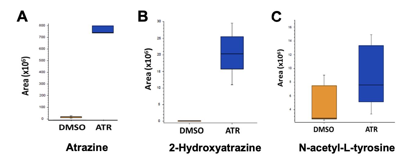 Fig. S6. Changes in select metabolites after ATR exposure. Metabolomic analysis of intestines exposed to DMSO or ATR revealed increased levels of atrazine (A), the ATR metabolite, 2-hydroxyatrazine (B), and N-acetyl-L-tyrosine (C), a metabolite associated with high ROS levels. P-value threshold: 0.05 and log2 fold change: 1. |