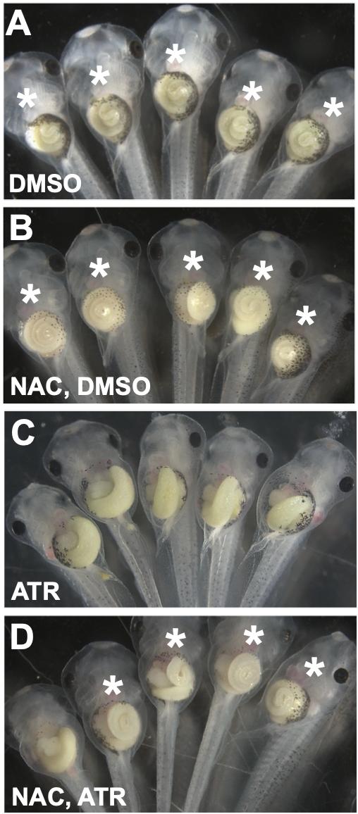 Fig. S7. Antioxidant pretreatment rescues ATR-induced intestinal elongation and rotation defects. B) Pretreating embryos with an antioxidant (NAC; B) does not affect the normal gut morphology (indicated by *) of DMSO controls (A). However, the elongation and rotation defects caused by ATR (C) are partially rescued by NAC pretreatment (D; p<0.01). A rescue was scored if guts exhibited 2+ intestinal coils with normal (CCW) rotation. Results were replicated in at least three independent experiments with 8-15 embryos each. |