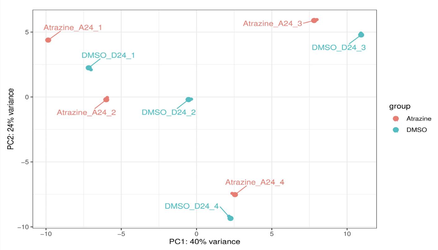 Fig. S8. Principal component analysis (PCA) of DMSO vs ATR RNAseq data. A PCA plot was generated to plot to assess sample outliers using the top 500 most variable genes after regularized log transformation. |