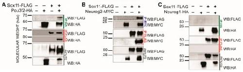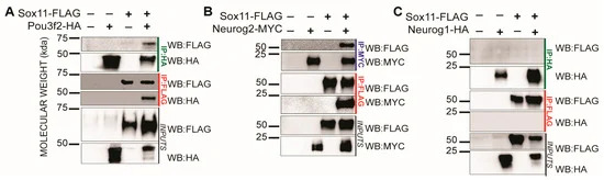 Figure 2. Xl Sox11 interacts with Pou3f2 and Neurog2, but not Neurog1. (A–C). Immunoprecipitation (IP) of Xl Sox11-FLAG and Pou3f2-HA (A), Neurog2-MYC (B), or Neurog1-HA (C) from in vitro translated proteins. Proteins were immunoprecipitated using either FLAG (red), HA (green), or MYC (blue) antibodies. Samples were analyzed by western blotting (WB) indicated on the right with FLAG-HRP, MYC-HRP, or HA-HRP. Input represents the total protein lysate.