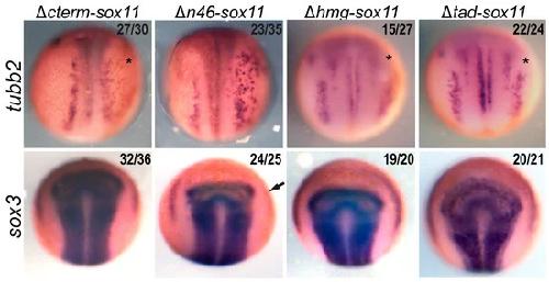Figure 4. Identification of Sox11 domains required for placode and neuron formation. WISH of neurula (stage 14/15) embryos injected in one of two cells (dorsal view, anterior to the top) with Dextran as a tracer and either Δcterm-Sox11, Δn46-Sox11, Δhmg-Sox11, or Δtad-Sox11 mRNA. The right side is the injected side, and the left side serves as control expression. Embryos were analyzed for expression of tubb2 for neurons or sox3 for neural progenitors. An arrow marks the reduction in sox3 expression in placodal progenitors, and an asterisk marks the loss of expression in the trigeminal placode. Numbers in the upper right of each image denote the number of embryos with the phenotype over the total analyzed. A one-sample proportion test reveals that the null hypothesis that the overexpression of the mRNA has no effect on tubb2 expression can be rejected in all cases except for the loss of the trigeminal placode for Δhmg-Sox11 p-value = 0.564.