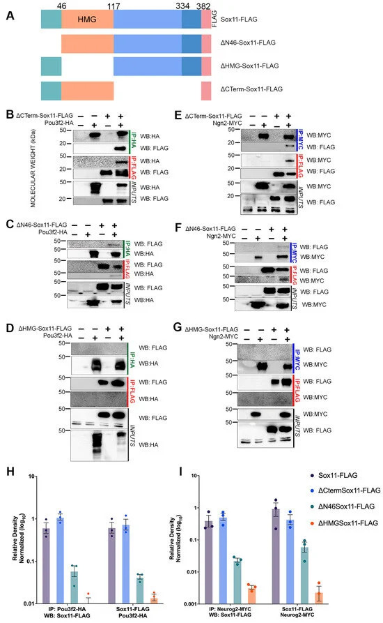Figure 3. Sox11 N-terminus is essential for protein–protein interactions. (A) Schematic of Sox11 and deletion constructs with referenced domains marked. ΔN46-Sox11-FLAG lacks the 46 amino acids (teal) upstream of the HMG domain. ΔHMG-Sox11-FLAG lacks the 72 amino acid HMG domain (orange), and ΔCterm-Sox11-FLAG lacks 265 amino acids (blue) and consists of the N-terminus and HMG domain. (C–G) Immunoprecipitation (IP) of ΔCterm-Sox11-FLAG, ΔN46-Sox11-FLAG, or ΔHMG-Sox11-FLAG with Pou3f2-HA or Neurog2-MYC (Ngn2-MYC). Proteins were generated via in vitro translation and immunoprecipitated using either FLAG (red), HA (green), or MYC (blue) antibodies. Samples were analyzed by WB with anti-FLAG-HRP, anti-HA-HRP, or anti-MYC-HRP. Inputs demonstrate each protein in the extract. (H) Graphical representation of protein co-immunoprecipitated (Sox11 variants and Pou3f2) from three replicates, one of which is represented in (B–D). (I) Graphical representation of protein co-immunoprecipitated (Sox11 variants and Neurog2) from three replicates, one of which is represented in (E–G). Co-expression bands were normalized to the input in each sample. Data represent the mean ± sem on a log10 scale with percent of pulldown across 3 experimental replicates.