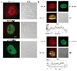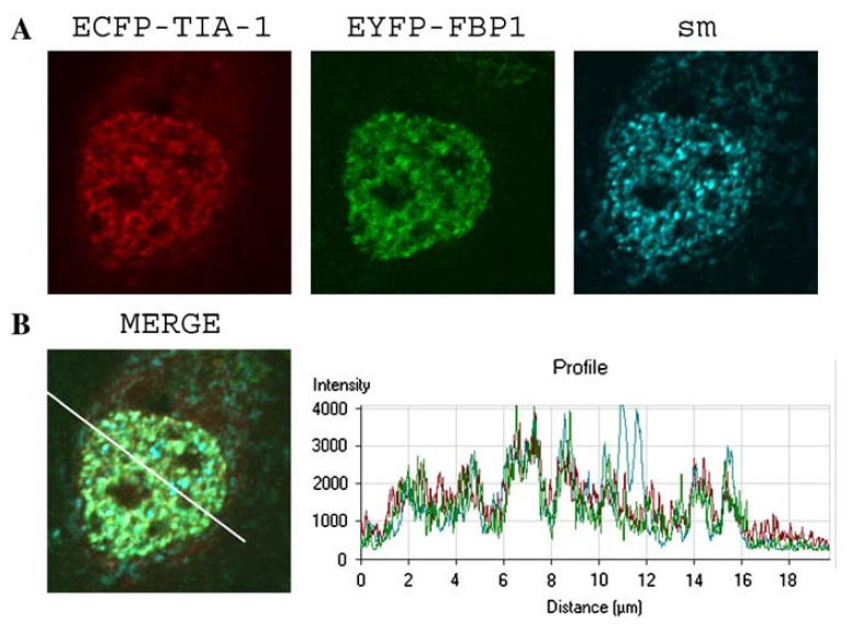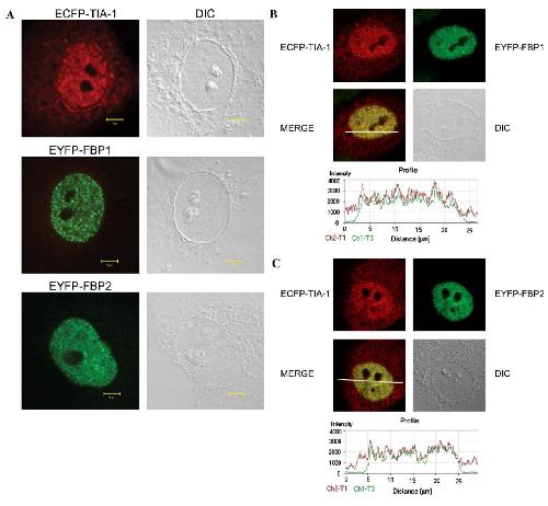 ECFP-TIA-1 and EYFP-FBP1 (or EYFP-FBP2) in the nucleus (yellow staining). The profiles reveal the red and green fluorescence intensities along a line