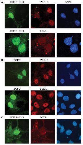 TIA-1 and TIAR; right panels: DAPI staining. (C) Localization of Boip in Cos cells transfected with pEGFP-C2-FBP2-KH3. Left panel, EGFP; middle