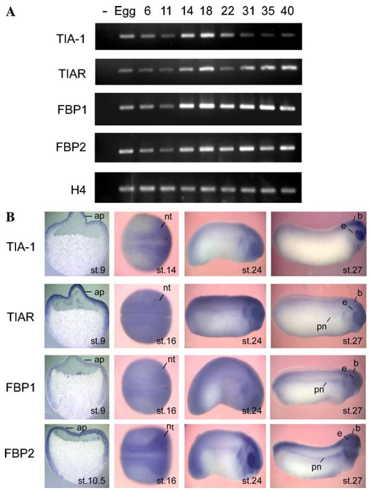 Fig. 4. TIA-1, TIAR, FBP1, and FBP2 are co-expressed during Xenopus